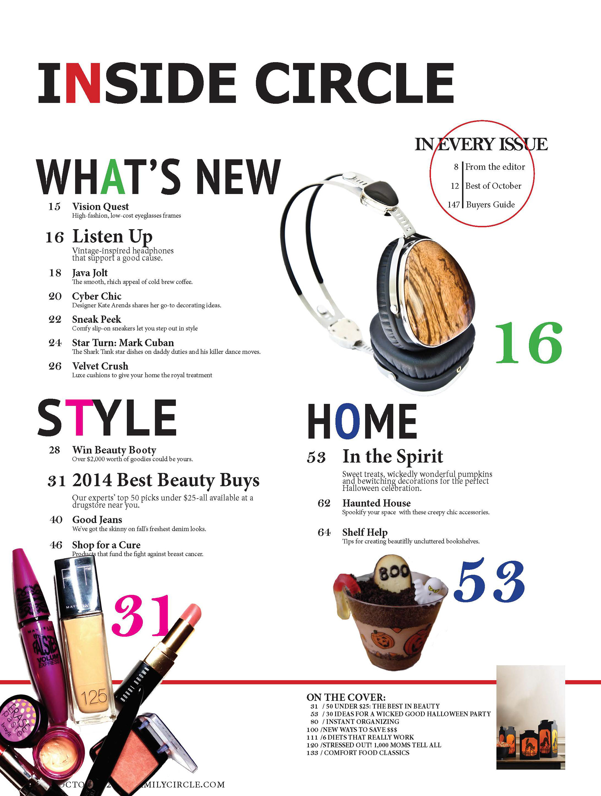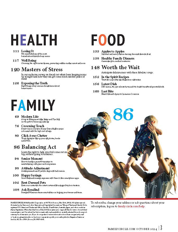 A redesign of the popular magazine Family Circle. Printed at standard magazine size. Contained cover, table of contents, and several editorial features, all of which were layed out and branded from scratch.